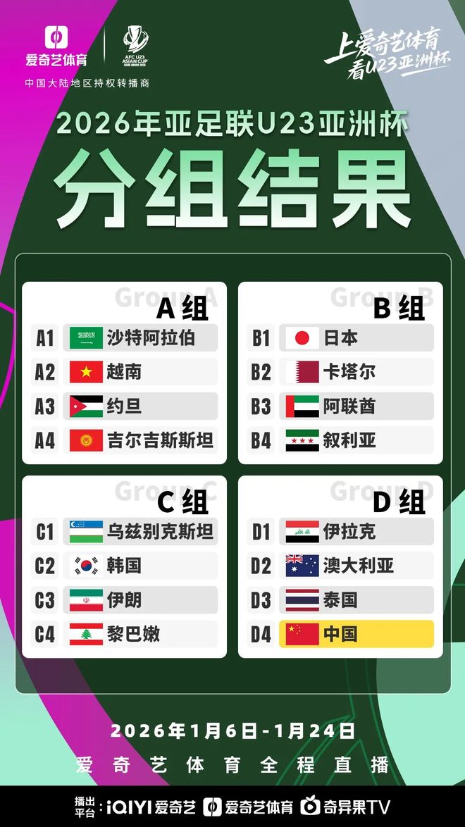 10月2日,举行了U23亚洲杯小组的抽奖仪式。 U23国家橄榄球队以四级球队参加了抽奖活动。最终,中国队分为D组,与包括伊拉克,澳大利亚和泰国在内的同一小组的对手。比赛将在所有IQIYI运动中现场直播。 A组:沙特阿拉伯团队,越南队,约旦队,KirguistánB组B组B组:日本队,卡塔尔队,阿拉伯联合酋长国团队,Siriano C Siriano C:Uzbekistan Team,Uzbekistan Team,Uzbekistan Team,韩国韩国队,伊朗队,黎巴嫩团队,黎巴嫩团队,黎巴嫩杯7号杯赛,是U23赛季,赛季赛,赛车杯,赛季杯,是杯赛。从2026年1月至24日,到726年底。目前正在启动时间表。每个小组中的两个最佳球员都进入了淘汰阶段。第一回合:1月8日22:00伊拉克与中国朗达2:1月11日,晚上7:30中国与澳大利亚朗达3:1月14日,下午7:30 特殊声明:以前的内容(在网络自我媒体平台的用户收取和发布了照片和视频(如果有的话)。该平台仅提供信息存储服务。 注意:以前的内容(如果您有照片或视频)将由社交媒体平台NetEase Hao的用户收取和发布,仅提供信息存储服务。
